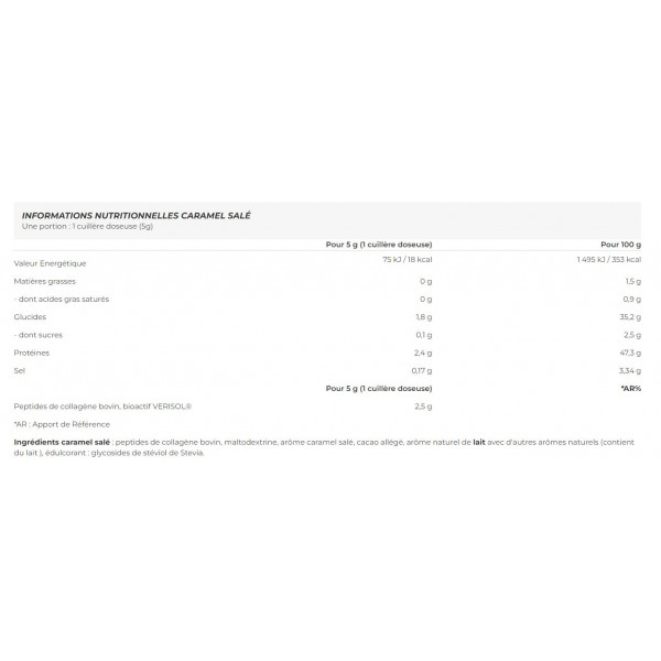 Ingredientes del caramelo salado: péptidos de colágeno bovino, maltodextrina, aroma de caramelo salado, cacao desnatado, aroma natural de leche con otros aromas naturales (contiene leche), edulcorante: glucósidos de esteviol de Stevia.
