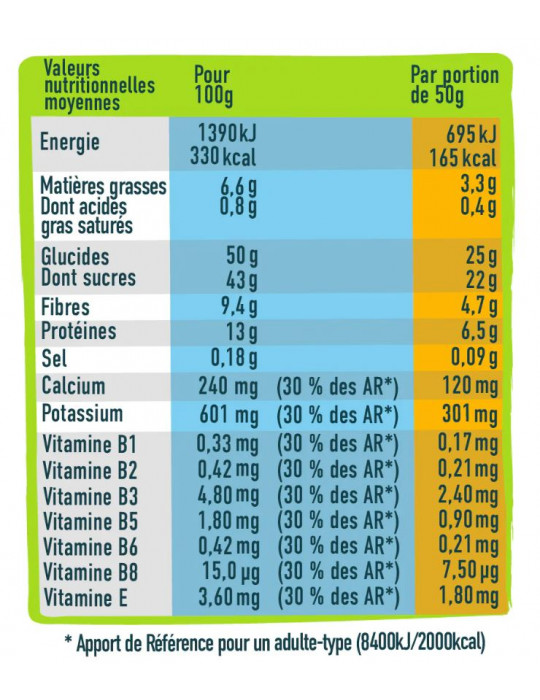 Ingredientes: albaricoques secos 23% (albaricoques 95%, harina de arroz, conservante: sulfitos), proteína de almendra escaldada 17,9%, manzanas deshidratadas 12% (manzanas, conservante: sulfitos), peras deshidratadas 12% (peras, dextrosa monohidrato), pasas sultanas (pasas, aceite de girasol), jarabe de caña (azúcar de caña, agua), almendras sin cáscara 5%, anacardos 3%, bayas de goji deshidratadas, grosellas negras deshidratadas infusionadas con zumo de manzana (grosellas negras 83%, zumo de manzana concentrado, zumo de limón concentrado, aceite de girasol), arándanos rojos secos azucarados (arándanos rojos 55%, azúcar, aceite de girasol), fibra de limón, fosfatos de potasio y de calcio, vitaminas (B1,B2,B3,B5,B6,B8,E).