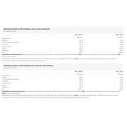 Ingredientes del chocolate doble: mezcla de proteínas de suero (95%), aislado de proteínas de suero(leche), concentrado de proteínas de suero hidrolizadas(leche), cloruro sódico, espesantes (goma de celulosa, goma xantana, carragenina), sal, emulgente (lecitina de soja), aromas, edulcorantes (sucralosa, glucósidos de esteviol), antiaglomerante (dióxido de silicio).