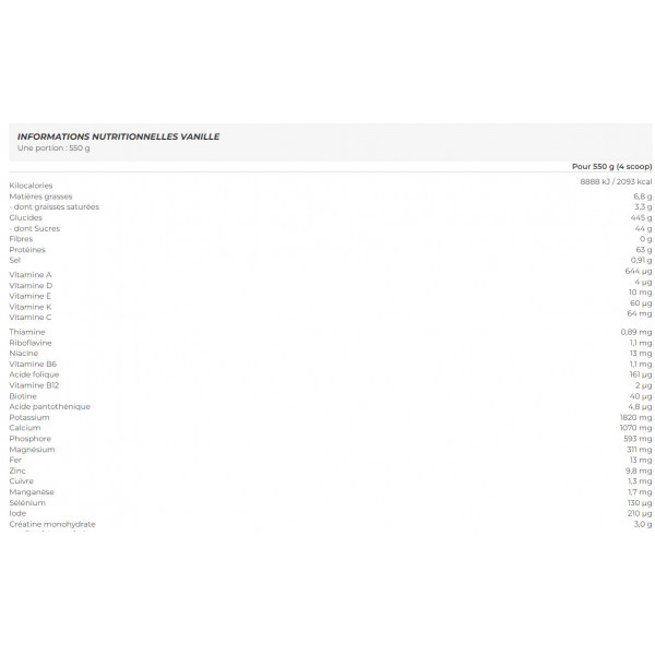 Este producto es adecuado tanto para principiantes como para deportistas experimentados que buscan aumentar rápidamente su masa muscular o que tienen dificultades para engordar. Una ración (4 cacitos) contienemás de 2000 calorías por ración. Incluye: 63 g de proteínas de asimilación variada, procedentes de concentrado de proteínas, aislado de proteína de suero y caseinato cálcico. Una cantidad importante de hidratos de carbono: 443 g por dosis, incluidos 44 g de azúcares. Así como 3 g de monohidrato de creatina diseñado para aumentar la fuerza y el rendimiento durante actividades intensas de corta duración.