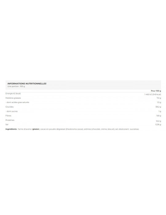 Ingredientes: harina de avena(gluten), cacao en polvo desgrasado (cacao theobroma), aromas (chocolate, nata, galleta), sal, edulcorante: sucralosa.