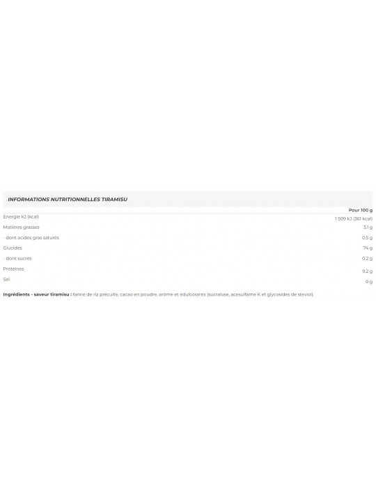 Ingredientes - Sabor tiramisú: harina de arroz precocida, cacao en polvo, aroma y edulcorantes (sucralosa, acesulfamo K y glucósidos de esteviol).
