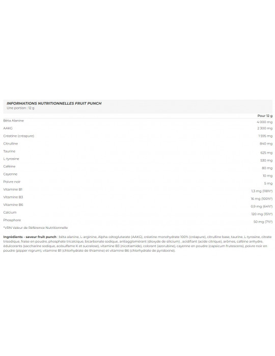 VRN Valor de referencia nutricional Ingredientes - sabor ponche de frutas : beta alanina, L-arginina, alfa-cetoglutarato (AAKG), creatina monohidrato 100% (creapure), citrulina base, taurina, L-tirosina, citrato trisódico, fresa en polvo, fosfato tricálcico, bicarbonato sódico, antiaglomerante (dióxido de silicio), acidulante (ácido cítrico), aromas, cafeína anhidra, edulcorantes (sacarina sódica, acesulfamo K y sucralosa), vitamina B3 (nicotiamida), colorante (azorrubina), cayena en polvo (capsicum frutescens), pimienta negra en polvo (pipper nigrum), vitamina B1 (clorhidrato de tiamina) y vitamina B6 (clorhidrato de piridoxina).