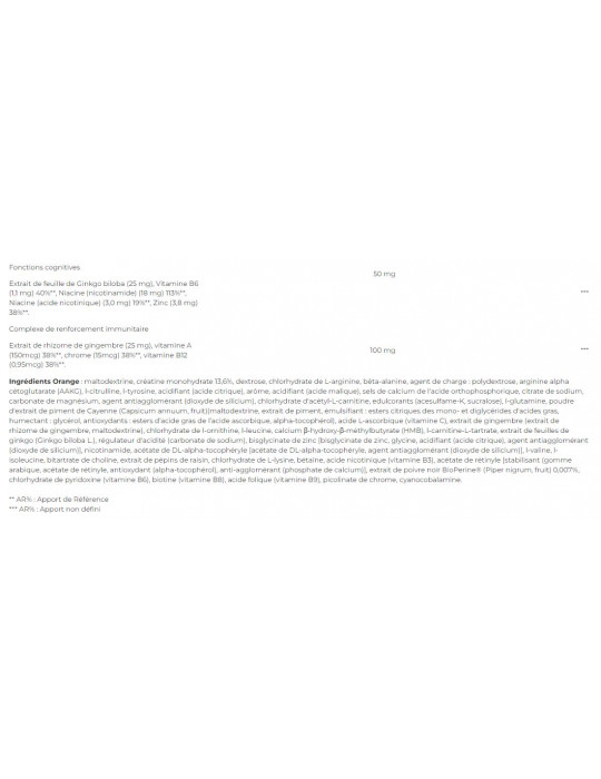 Ingredientes naranja: maltodextrina, monohidrato de creatina 13,6%, dextrosa, hidrocloruro de L-arginina, beta-alanina, agente de carga : polidextrosa, alfa-cetoglutarato de arginina (AAKG), l-citrulina, l-tirosina, acidulante (ácido cítrico), aroma, acidulante (ácido málico), sales cálcicas de ácido ortofosfórico, citrato de sodio, carbonato de magnesio, antiaglomerante (dióxido de silicio), clorhidrato de acetil-L-carnitina, edulcorantes (acesulfamo-K, sucralosa), l-glutamina, extracto de pimienta de cayena en polvo (Capsicum annuum, fruta) (maltodextrina, extracto de pimienta, emulgente : ésteres cítricos de mono- y diglicéridos de ácidos grasos, humectante: glicerol, antioxidantes: ésteres de ácidos grasos de ácido ascórbico, alfa-tocoferol), ácido L-ascórbico (vitamina C), extracto de jengibre (extracto de rizoma de jengibre, maltodextrina), clorhidrato de l-ornitina, l-leucina, β-hidroxi-β-metilbutirato de calcio (HMB), l-carnitina-L-tartrato, extracto de hoja de ginkgo (Ginkgo biloba L. [bisglycinate de zinc, glycine, acidifiant (acide citrique), agent antiagglomérant (dioxyde de silicium)] [acétate de DL-alpha-tocophéryle, agent antiagglomérant (dioxyde de silicium)]), regulador de la acidez (carbonato sódico), bisglicinato de zinc , nicotinamida, acetato de DL-alfa-tocoferil , l-valina, l-isoleucina, bitartrato de colina, extracto de semilla de uva, hidrocloruro de L-lisina, betaína, [stabilisant (gomme arabique, acétate de rétinyle, antioxydant (alpha-tocophérol), anti-agglomérant (phosphate de calcium)] ácido nicotínico (vitamina B3), acetato de retinilo , extracto de pimienta negra BioPerine® (Piper nigrum, fruto) 0,007%, clorhidrato de piridoxina (vitamina B6), biotina (vitamina B8), ácido fólico (vitamina B9), picolinato de cromo, cianocobalamina.