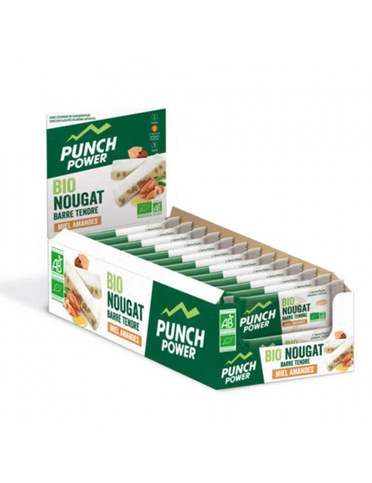 La caja de Bio Nougat (24x30g) son barritas de turrón bio, las primeras del mercado, fabricadas por la marca Punch Power.