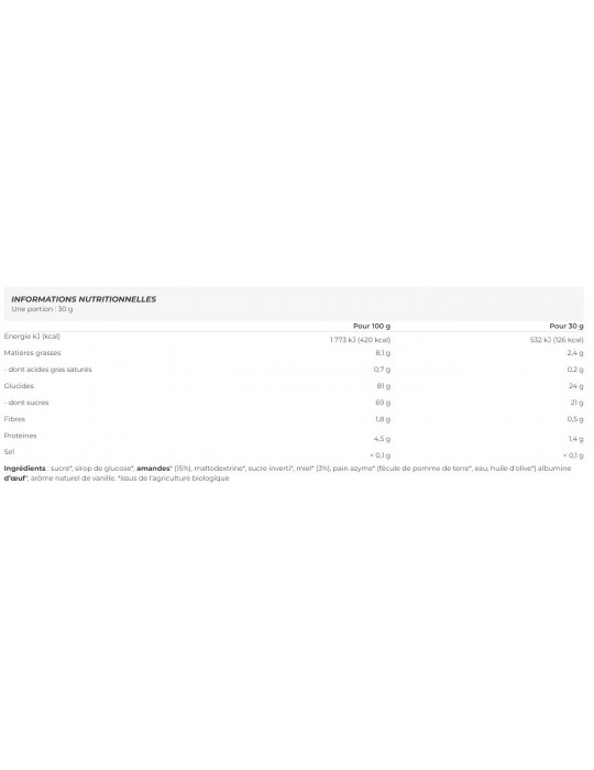 Ingredientes: azúcar*, jarabe de glucosa*, almendras*(15%), maltodextrina*, azúcar invertido*, miel* (3%), pan ácimo* (fécula de patata*, agua, aceite de oliva*) albúmina de huevo*, aroma natural de vainilla. *procedente de la agricultura ecológica