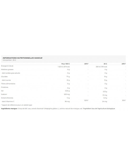 Ingredientes del mango: Sirope de trigo*, agua, extracto de acerola* (Malpighia glabra L.), aroma natural de mango, sal. *Ingrediente procedente de la agricultura ecológica