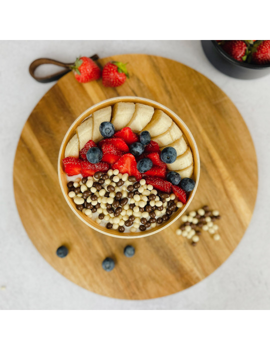 Ingredientes fresa plátano : copos de avena (gluten) 53%, salvado de avena (gluten) 20%, concentrado de proteína de suero (leche) 15%, inulina 8%, trozos de plátano (trozos de plátano deshidratado, aceite de coco, sacarosa, miel, aroma), aromas, trozos de fresa liofilizada, acidulante (ácido málico), polvo de concentrado de remolacha [maltodextrine, concentré de betterave, acide (acide citrique)], sal, edulcorante (sucralosa).