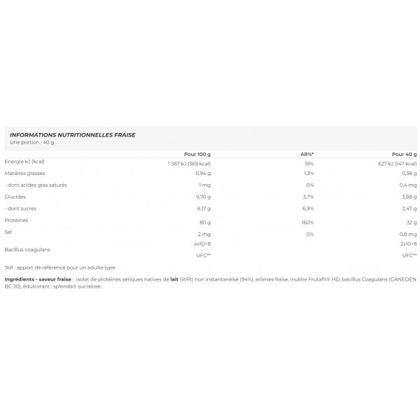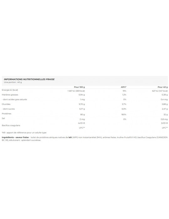 Ingredientes - Sabor fres a: aislado de proteína de leche de suero nativo (WPI) no instantáneo (94%), sabor fresa, inulina Frutafit® HD, bacillus coagulans (GANEDEN BC 30), edulcorante: sucralosa splenda®.
