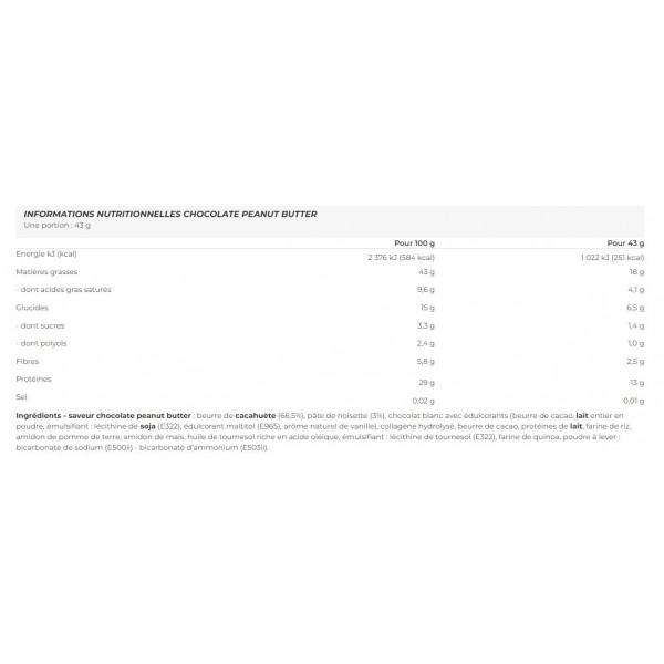 Ingredientes - chocolate blanco sabor cacahueteMantequillacacahuete(66,5%), chocolate blanco con edulcorantes (manteca de cacao,lecheHarina integral en polvo, emulgente: lecitina desoja(E322), edulcorante de maltitol (E965), aroma natural de vainilla) (9%), colágeno hidrolizado, manteca de cacao, proteína de lecheleche, harina de arroz, fécula de patata, almidón de maíz, aceite de girasol alto oleico, emulgente: lecitina de girasol (E322), harina de quinoa, gasificante: bicarbonato sódico (E500ii) - bicarbonato amónico (E503ii).