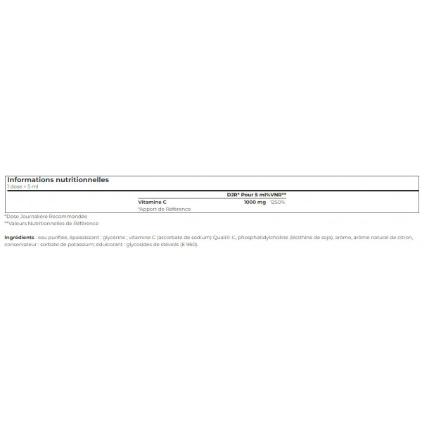 Además, puede tomarse durante todo el año. Su eficacia se ve reforzada por su proceso de encapsulación liposomal de última generación, que garantiza una absorción óptima y una excelente tolerancia intestinal de la vitamina C por el organismo. Su dosis óptima de vitamina C liposomal representa 1.000 mg por porción de 5 ml.