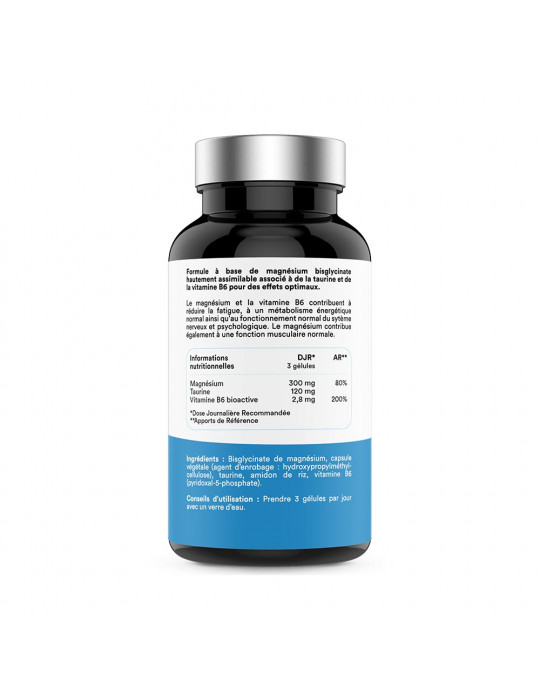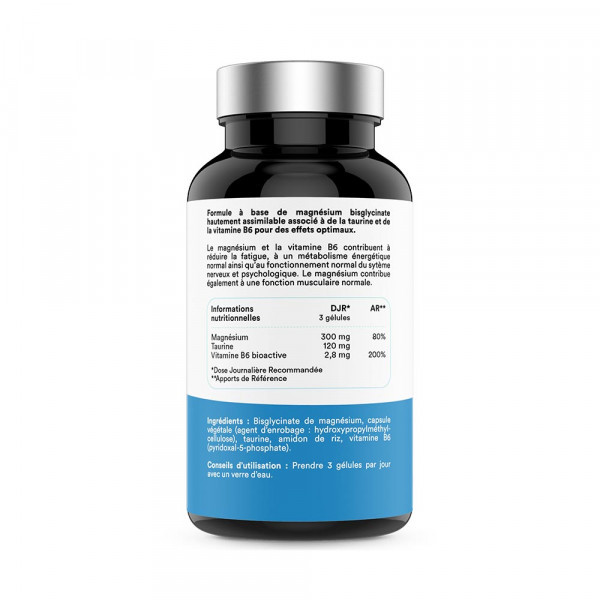 Este suplemento está formulado a partir de bisglicinato de magnesio, una forma de magnesio altamente biodisponible que el organismo absorbe fácilmente y no provoca molestias digestivas. Una dosis diaria (3 cápsulas) aporta 300 mg de magnesio.