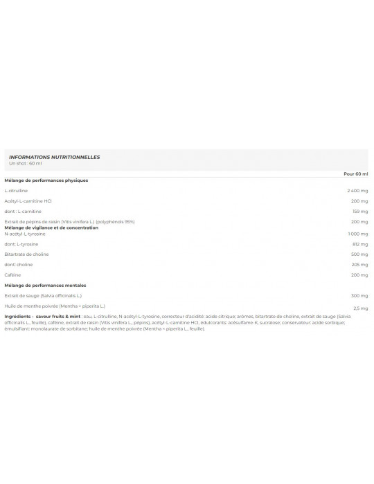 Ingredientes - sabor a fruta y menta: agua, L-citrulina, N-acetil-L-tirosina, regulador de la acidez: ácido cítrico; aromas, bitartrato de colina, extracto de salvia (Salvia officinalis L., hoja), cafeína, extracto de uva (Vitis vinifera L., semillas), acetil-L-carnitina HCl, edulcorantes: acesulfamo-K, sucralosa; conservante: ácido sórbico; emulgente: monolaurato de sorbitán; aceite de menta piperita (Mentha × piperita L., hoja).
