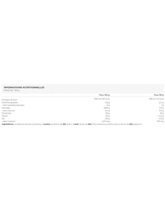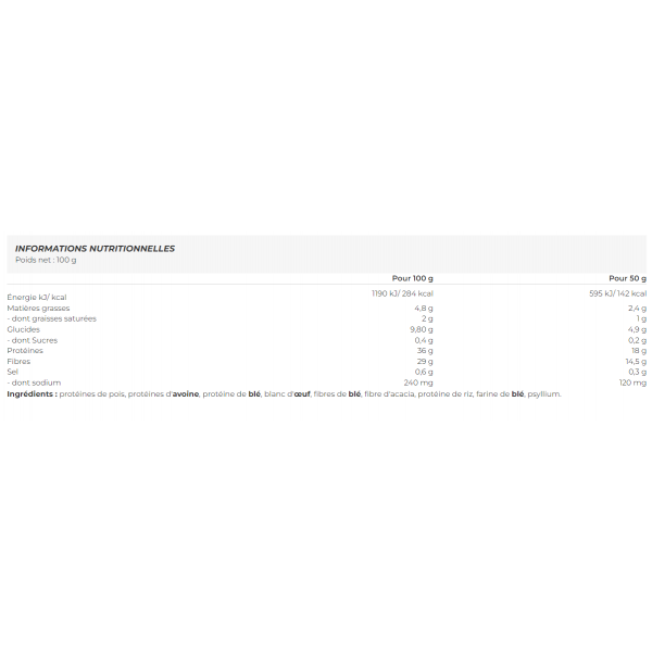 Ingredientes: proteína de guisante, proteína deavena, proteína de trigo, clara dehuevo, fibra de trigo, fibra de acacia, proteína de arroz, harina de trigo, psyllium.