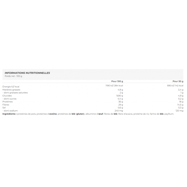 Ingredientes: proteína de guisante, proteína deavena, proteína de trigo(gluten), albúmina dehuevo, fibra de trigo, fibra de acacia, proteína de arroz, harina de trigo, psyllium.