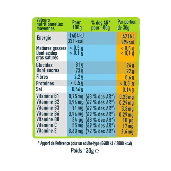 | Calcio Vitamina B1 Vitamina B3 Vitamina B6 Vitamina C | 400 mg (50% de AR*) 0,7 mg (64% de RA*) 11 mg (69% de RA*) 0,9 mg (64% de RA*) 53 mg (66% de RA*) | 120 mg 0,21 mg 3,30 mg 0,27 mg 15,9 mg |
