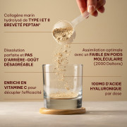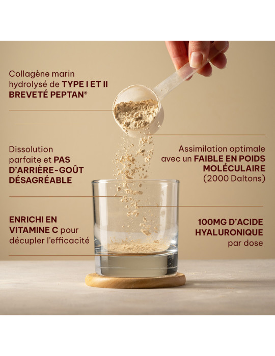 [agents antimousse (diméthyle polysiloxane, dioxyde de silicium)]Ingredientes neutros: colágeno de pescado 83%, agente de carga (polidextrosa), hialuronato de sodio 0,93%, ácido L-ascórbico (vitamina C) 0,83%, agente antiespumante .