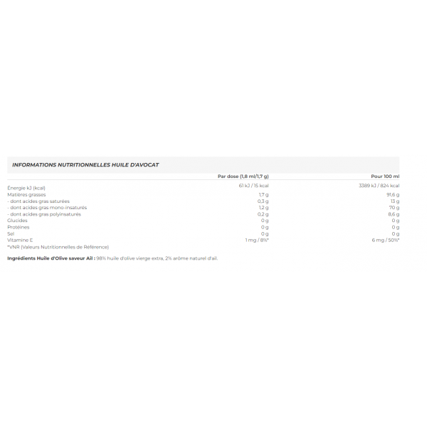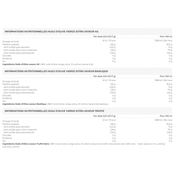 Ingredientes Aceite de oliva aromatizado con ajo : 98% aceite de oliva virgen extra, 2% aroma natural de ajo.