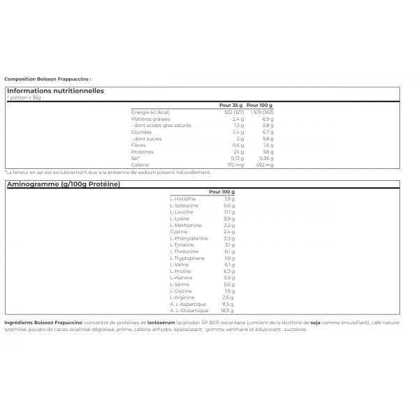 Ingredientes Bebida Frapuccino: Lacprodan SP-8011 Concentrado instantáneo de proteínas de suero de leche (contiene lecitina de soja como emulgente), café natural liofilizado, cacao alcalino en polvo desgrasado, aroma, cafeína anhidra, espesante: goma xantana y edulcorante: sucralosa.