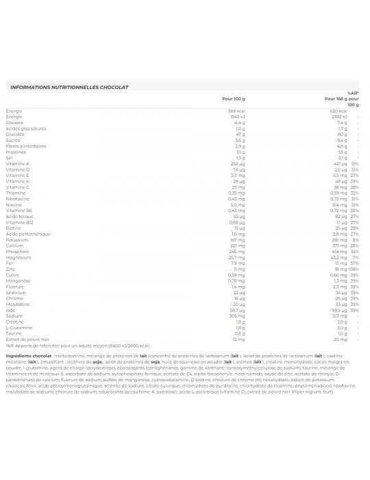 Ingredientes del chocolate maltodextrina, mezcla de proteínas deleche(concentrado de proteína de suero (leche), aislado de proteína de suero (leche), caseína micelar (leche), emulgente: lecitina de soja), aislado de proteínas de soja, aceite de girasol en polvo (leche), aromas (leche), monohidrato de creatina, cacao en polvo bajo en grasas, l-glutamina, agente de carga (polidextrosa), espesantes (carragenano, goma xantana, carboximetilcelulosa sódica), taurina, mezcla de vitaminas y minerales (L-ascorbato sódico, pirofosfato férrico, acetato de DL-alfa-tocoferilo, nicotinamida, óxido de zinc, acetato de retinilo, D-pantotenato cálcico, fluoruro sódico, sulfato de manganeso, cianocobalamina, D-biotina, cloruro de cromo (III) hexahidrato, yoduro potásico, colecalciferol, ácido pteroilmonoglutámico, selenito sódico, citrato cúprico, clorhidrato de piridoxina, clorhidrato de tiamina, fitomenadiona, riboflavina, molibdato sódico), cloruro sódico, edulcorantes (acesulfamo-K, sucralosa), ácido L-ascórbico (vitamina C), extracto de pimienta negra (Piper nigrum, fruto).