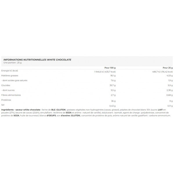 Ingredientes - sabor chocolate blanco : harina de TRIGO(GLUTEN), grasas vegetales no hidrogenadas (cacao, girasol), 15% chips de chocolate blanco (azúcar, LECHE en polvo (27%), manteca de cacao (23,6%), emulgente: lecitina de SOJA y aroma : aroma natural de vainilla), edulcorante: isomalt, agente de carga: polidextrosa, concentrado de proteínas de SOJA, aceite de girasol, claras de HUEVO, salvado de avena(GLUTEN), concentrado de proteínas de guisante, aroma natural de vainilla gasificante: carbón amónico.