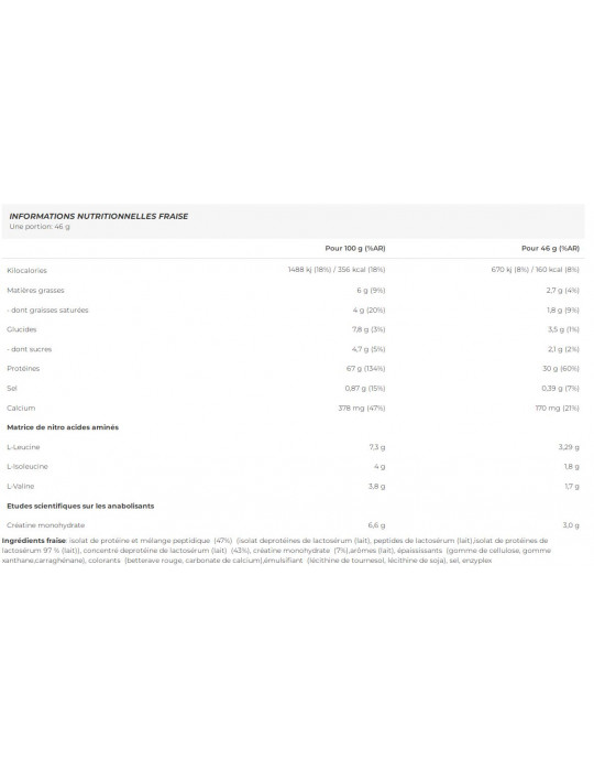 Ingredientes de la fresaAislado de proteínas y mezcla de péptidos (47%) (aislado de proteínas de suero de leche (leche), péptidos de suero de leche (leche), aislado de proteínas de suero de leche 97 % (leche)), concentrado de proteínas de suero de leche (leche) (43%), monohidrato de creatina (7%), aromas (leche), espesantes (goma de celulosa, goma xantana, carragenina), colorantes (rojo de remolacha, carbonato cálcico), emulgentes (lecitina de girasol, lecitina cálcica) soja), sal, enzyplex.