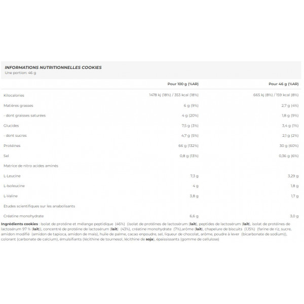Ingredientes de las galletasAislado de proteínas y mezcla de péptidos (46%) (aislado de proteínas de suero de leche (leche), péptidos de suero de leche (leche), aislado de proteínas de suero de leche 97 % (leche)), concentrado de proteínas de suero de leche (leche) (43%), monohidrato de creatina (7%), aroma (leche), migas de galleta (1,15%) [harina de arroz, azúcar, almidón modificado (almidón de tapioca, almidón de maíz), aceite de palma, cacao en polvo, sal, licor de chocolate, aroma, gasificante (bicarbonato sódico)], colorante (carbonato cálcico), emulgentes (lecitina de girasol, lecitina de potasio, sorbato potásico, sulfato potásico soja), espesantes (goma de celulosa).