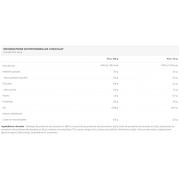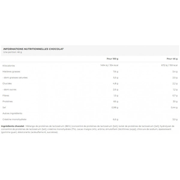 Ingredientes del chocolateUna mezcla de suero de leche (86%) (concentrado de proteínas de suero de leche [lecheAislado de proteína suero de leche [lecheHidrolizado de concentrado de proteínas suero de leche [lecheMonohidrato de creatina (7%), cacao desnatado (4%), aroma, emulgente (lecitina (soja)], cloruro sódico, espesante (goma guar), edulcorantes (acesulfamo-K, sucralosa).