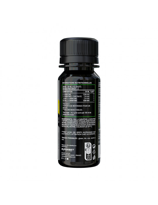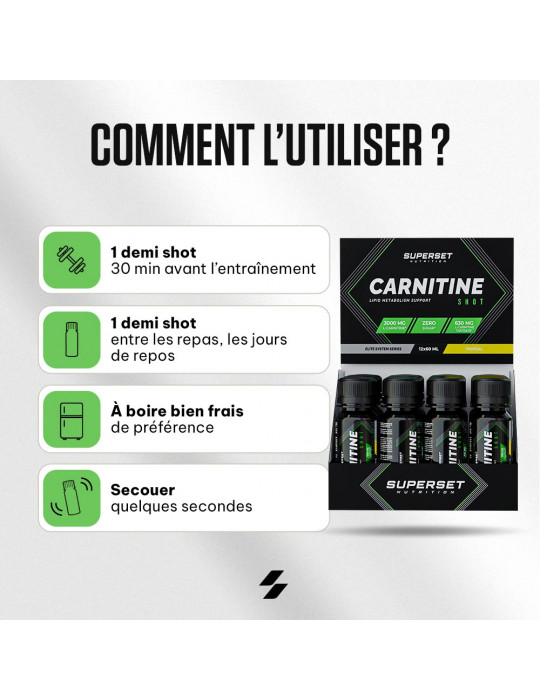 La caja de CARNITINA shot (12X60ML) formulada por los expertos en nutrición de la marca Superset Nutrition puede ser beneficiosa para las personas que siguen una dieta controlada o un programa de ejercicio intenso. Es ideal si su objetivo es perder peso o adelgazar. La suplementación con L-carnitina puede :