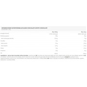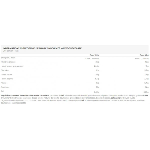 Ingredientes - chocolate negro sabor chocolate blanco: proteína de leche, chocolate con edulcorante [pasta de cacao, oligofructosa, cacao en polvo bajo en grasa, grasa de leche, emulgente : lecitina de girasol (E322), aroma natural de vainilla, edulcorante glucósidos de esteviol (E960a)], manteca de cacao, colágeno hidrolizado, fructooligosacáridos, aceite de coco, chocolate blanco con edulcorante [edulcorante: maltitol (E965), leche entera en polvo, emulgente: lecitina de girasol (E322), vainillina, edulcorante: sucralosa (E955).