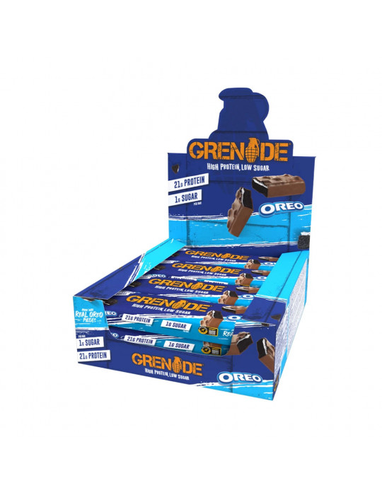 Ingredientes de las Oreo mezcla de proteínas (caseinato cálcico ( leche ), aislado de proteína de suero (leche), chocolate con leche con edulcorante (20%) (edulcorante: maltitol; manteca de cacao, leche cacao entero en polvo, pasta de cacao, emulgente: lecitina de cacao soja ;aroma natural), hidrolizado de colágeno bovino, humectante: glicerol; edulcorantes: Maltitol, Sucralosa ; Aceite de palma, agua, cacao en polvo bajo en grasa (3%), harina de trigo , almidón de maíz, aceite de colza, agente de carga: polidextrosa ; sal marina, almidón de trigo , emulgente: lecitina de trigo soja ; gasificantes: carbonatos de amonio, carbonatos de sodio; Regulador de la acidez: hidróxido de sodio; Aromas.