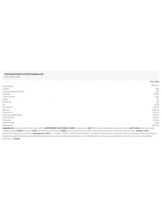 Ingredientes : chispas de coco (28%)(ANHIDRIDO DE AZUFRE(E220)), chocolate con leche (20%) (azúcar, manteca de cacao, LECHE entera en polvo, pasta de cacao, grasa láctea anhidra(LECHE), emulgente (lecitina de SOJA), aroma natural de vainilla), azúcar, jarabe de glucosa, fibra de maíz soluble, lactosa(LECHE), humectante (glicerol), suero de leche en polvo(LECHE), L-carnitina (0,31%), vitaminas y minerales (citrato de magnesio concentrado, ácido ascórbico, ácido nicotínico, dl-alfa-tocoferolacetato, d-pantotenato de calcio, clorhidrato de piridoxina, mononitrato de tiamina, cianocobalamina), sal marina, aroma, emulgente (lecitina de soja).