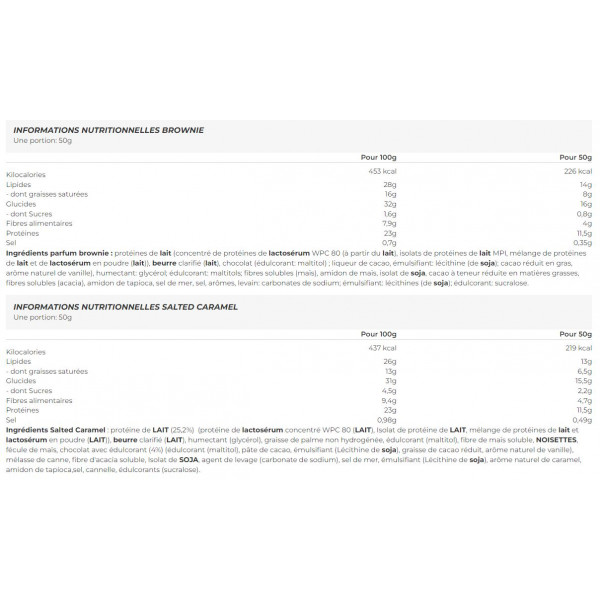 Ingredientes sabor brownie: proteína de leche ( concentrado de proteína de suero WPC 80 (de leche), aislado de proteína de leche MPI, mezcla de proteína de leche y suero en polvo(leche)), mantequilla clarificada(leche), chocolate (edulcorante: maltitol); licor de cacao, emulgente: lecitina (soja); cacao reducido en grasa, aroma natural de vainilla), humectante: glicerol; edulcorante: maltitoles; fibra soluble (maíz), almidón de maíz, aislado de soja, cacao reducido en grasa, fibra soluble (acacia), almidón de tapioca, sal marina, sal, aromas, leudante: carbonatos de sodio; emulgente: lecitinas (soja); edulcorante: sucralosa.