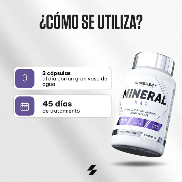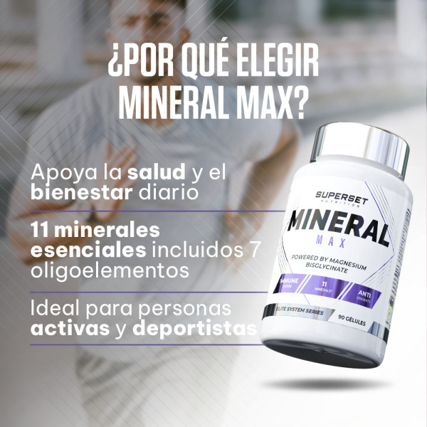 Este MINERAL MAX (90 CAPS) es una fórmula de ingredientes que contiene 11 minerales esenciales, cada uno con un papel específico en el apoyo diario a su salud y bienestar, en particular el trío de calcio, fósforo y magnesio, tan popular entre los deportistas:
