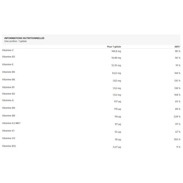 Este suplemento contiene una mezcla de 14 vitaminas esenciales. Incluye vitamina A, que ayuda a mantener una piel sana y refuerza el sistema inmunitario, así como una serie de vitaminas del grupo B (B1, B2, B3, B5, B6, B8, B9 y B12) para un metabolismo energético óptimo. También hay vitaminas C, D3, E EVNol™, K1 y K2-MK7 MenaQ7®.