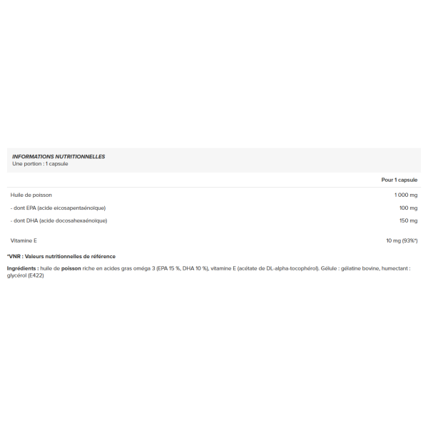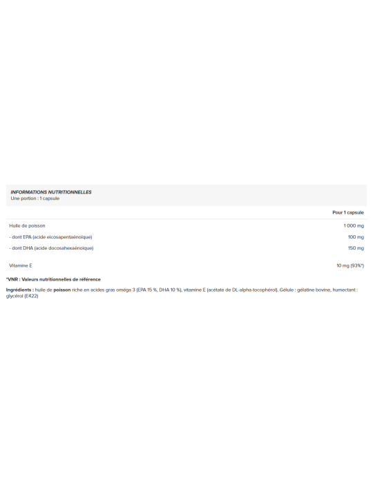Ingredientes: aceite de pescado rico en ácidos grasos omega-3 (EPA 15%, DHA 10%), vitamina E (acetato de DL-alfa-tocoferol). Cápsula: gelatina bovina, humectante: glicerol (E422)