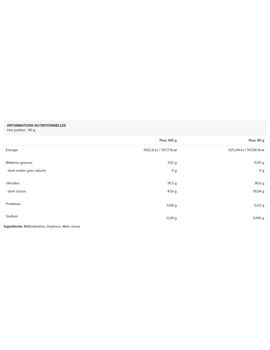 La dextrosa (50%) es un hidrato de carbono de asimilación rápida, que contribuye a aumentar el balance energético y desempeña un papel central en el aporte inmediato de energía. La maltodextrina (30%) proporciona una energía continua y moderada, ideal para los esfuerzos de intensidad media. El maíz céreo (20%) aporta hidratos de carbono complejos, ayudando a reponer las reservas de glucógeno y favoreciendo una recuperación óptima tras un esfuerzo físico intenso.