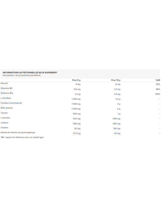 Ingredientes - sabor frambuesa azul: l-citrulina DL-malato, creatina monohidrato, beta-alanina, taurina, l-tirosina, colina bitartrato, cafeína anhidra, extracto de galanga mayor (Alpinia galanga, rizoma), antiaglomerante (dióxido de silicio [nano]), aroma, regulador de la acidez (ácido cítrico), edulcorante (sucralosa), edulcorante (glucósidos de esteviol), regulador de la acidez (ácido tartárico), niacina (nicotinamida), metilcobalamina (vitamina B12), colorante (azul brillante FCF), clorhidrato de piridoxina (vitamina B6).