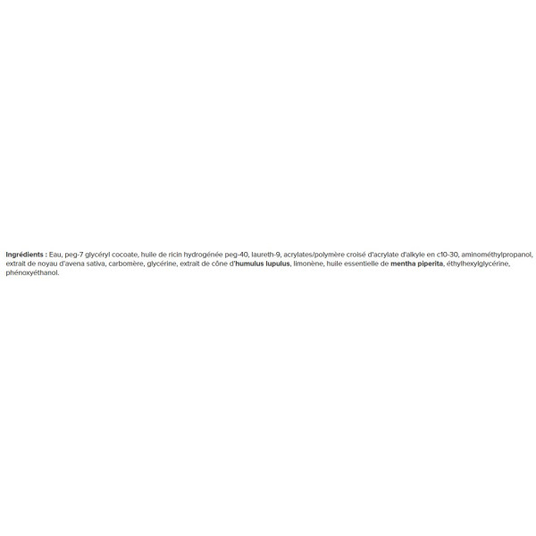 Ingredientes: Agua, peg-7 glyceryl cocoate, peg-40 hydrogenated castor oil, laureth-9, c10-30 alkyl acrylates/cross-polymers, aminomethylpropanol, avena sativa kernel extract, carbomer, glycerine,humulus lupulus cone extract, limonene, mentha piperita essential oil, ethylhexylglycerine, phenoxyethanol.