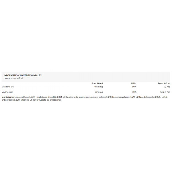 Ingredientes: Agua, acidulante: E330, reguladores de la acidez: E331, E332, citrato de magnesio, aroma, colorante: E160a, conservantes: E211, E202, edulcorantes: E955, E950, antioxidante: E300, vitamina B6 (clorhidrato de piridoxina).