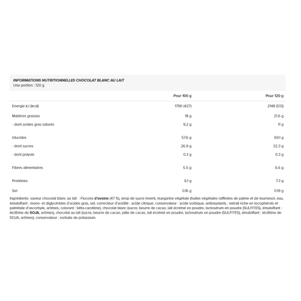 Ingredientes- Sabor chocolate blanco con leche : Copos avena (47%), jarabe de azúcar invertido, margarina vegetal (aceites refinados de palma y girasol, agua, emulgente: mono y diglicéridos de ácidos grasos, sal, regulador de la acidez: ácido cítrico, conservador: ácido sórbico, antioxidantes: extracto rico en tocoferoles y palmitato de ascorbilo, aromas, colorante: betacaroteno), chocolate blanco (azúcar, manteca de cacao, leche leche desnatada en polvo, suero de leche polvo (SULFITOS), emulgente: lecitina de SOJA, sabores), chocolate leche (azúcar, manteca de cacao, pasta de cacao, leche leche desnatada en polvo, suero de leche polvo (SULFITOS), emulgente: lecitina de SOJA, conservante: sorbato potásico.