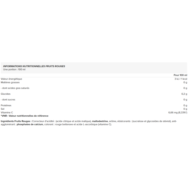 Ingredientes de los frutos rojos: regulador de la acidez: (ácido cítrico y ácido málico), maltodextrina, aroma, edulcorantes: (sucralosa y glucósidos de esteviol), antiaglomerante: fosfatos de calcio, color: rojo remolacha y ácido L-ascórbico (vitamina C).