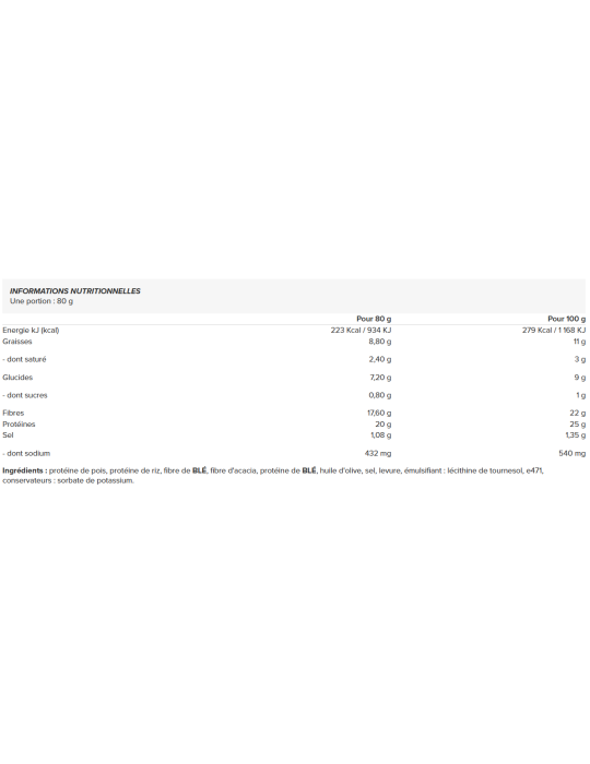 Ingredientes: proteína de guisante, proteína de arroz, fibra de TRIGO, fibra de acacia, proteína de TRIGO, aceite de oliva, sal, levadura, emulgente: lecitina de girasol, e471, conservantes: sorbato potásico.