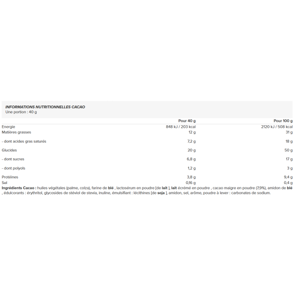 Ingredientes Cacao: aceites vegetales (palma, colza), harina de trigo, suero en polvo [de leche], leche desnatada en polvo, cacao en polvo desgrasado (7,9%), almidón de trigo, edulcorantes: eritritol, glucósidos de esteviol de stevia, inulina, emulgente: lecitina [de soja], almidón, sal, aroma, gasificante: carbonatos de sodio.