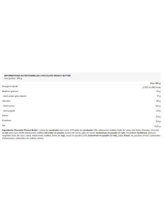 Ingredientes Mantequilla de cacahuete con chocolate: crema de cacahuete sin azúcar 27% ( pasta de cacahuete 24%, edulcorante: maltitol, aceite de colza, sal), harina de avena, chocolate con leche sin azúcar 16,8% (edulcorante: maltitol, leche entera en polvo, manteca de cacao, pasta de cacao, suero en polvo [de leche], emulgente: lecitinas), grasas vegetales (coco, colza), edulcorantes: maltitol, harina de soja, cacao en polvo 2,5%, suero en polvo [de leche], pulpa de huevo, sal, gasificantes: carbonatos de amonio, carbonatos de sodio, aroma.