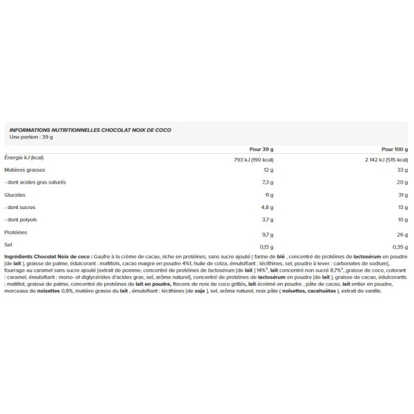 Ingredientes Chocolate con coco: Gofre de crema de cacao, rico en proteínas, sin azúcares añadidos [harina de trigo, concentrado de proteína de suero [leche ] en polvo, grasa de palma, edulcorante: maltitoles, cacao desgrasado en polvo 4%1, aceite de colza, emulgente: lecitinas, sal, gasificante: carbonatos de sodio], relleno de caramelo sin azúcares añadidos [extracto de manzana, concent rado d e proteína de suero [leche] en polvo, grasa de palma, edulcorante: maltitoles, cacao desgrasado en polvo 4 , aceite de colza, emulgente: lecitinas, sal, gasificante: carbonatos de sodio]: lecitinas, sal, gasificante: carbonatos de sodio], relleno de caramelo sin azúcar añadido [extracto de manzana, concentrado de proteína de suero 14%², leche condensada sin azúcar 8,7%², grasa de coco, colorante: caramelo, emulgente: mono- y diglicéridos de ácidos grasos, sal, aroma natural], concentrado de proteína de suero en polvo [leche ], grasa de cacao, edulcorantes : maltitol, grasa de palma, concentrado de proteínas lácteas en polvo , copos de coco tostado, leche desnatada en polvo, pasta de cacao, leche entera en polvo, trocitos de avellana 0,8%, grasa láctea, emulgente: lecitina [soja ], sal, aroma natural, pasta de frutos secos (avellanas, cacahuetes ), extracto de vainilla.