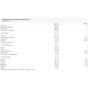 Ingredientes tropicales : L-citrulina 14%, beta-alanina 13%, bitartrato de colina, gluconato de magnesio, hidrocloruro de L-arginina 7,4%, agente de carga (polidextrosa), acidulante (ácido málico), aromas, sales potásicas de ácido ortofosfórico, sales cálcicas de ácido cítrico, citrato de sodio, cloruro de potasio, L-tirosina 2,3%, betaína, acidulante (ácido cítrico), antiaglomerante (dióxido de silicio), preparado de extracto de ashwagandha [extrait de racine d’ashwagandha (Withania somnifera) 0,79%, maltodextrine], ácido L-ascórbico, edulcorante (sucralosa), sal, extracto de raíz de ginseng coreano (Panax ginseng) 0,18%, D-pantotenato cálcico, ácido nicotínico, colorante (tartrazina, rojo AR)1, clorhidrato de piridoxina, cianocobalamina. 1Tartrazina, rojo allura AC: Puede provocar problemas de atención y comportamiento en los niños.