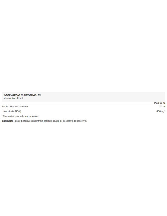 Zumo concentrado de remolacha - del cual nitrato (NO3-) | 60 ml 400 mg^ |