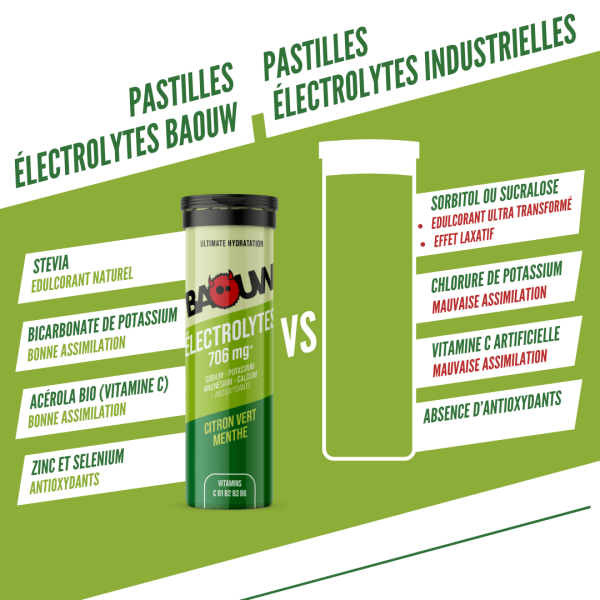Electrolitos (10tabs) de Baouw son comprimidos de hidratación diseñados para satisfacer las necesidades de los deportistas que desean combinar rendimiento, salud y naturalidad. Cada tableta aporta 706 mg de electrolitos, un 60% más que la media del mercado, para compensar eficazmente las pérdidas de minerales a través de la transpiración.