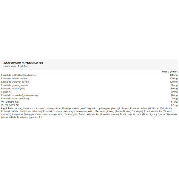 Ingredientes: Antiaglomerante: carbonato de magnesio, Cubierta de la cápsula vegetal: hidroxipropilmetilcelulosa, Extracto de meliloto (Melilotus officinalis L.), Extracto de levístico (Levisticum officinale), Extracto de shatavari (Asparagus racemosus Willd.), Extracto de ginseng (Panax ginseng CA Meyer), Extracto de tribulus (Tribulus terrestris), L-arginina, Antiaglomerante: sales magnésicas de ácidos grasos, Extracto de boswellia (Boswellia serrata), Extracto de pimienta negra (Piper nigrum), Cianocobalamina (vitamina B12), Riboflavina (vitamina B2)